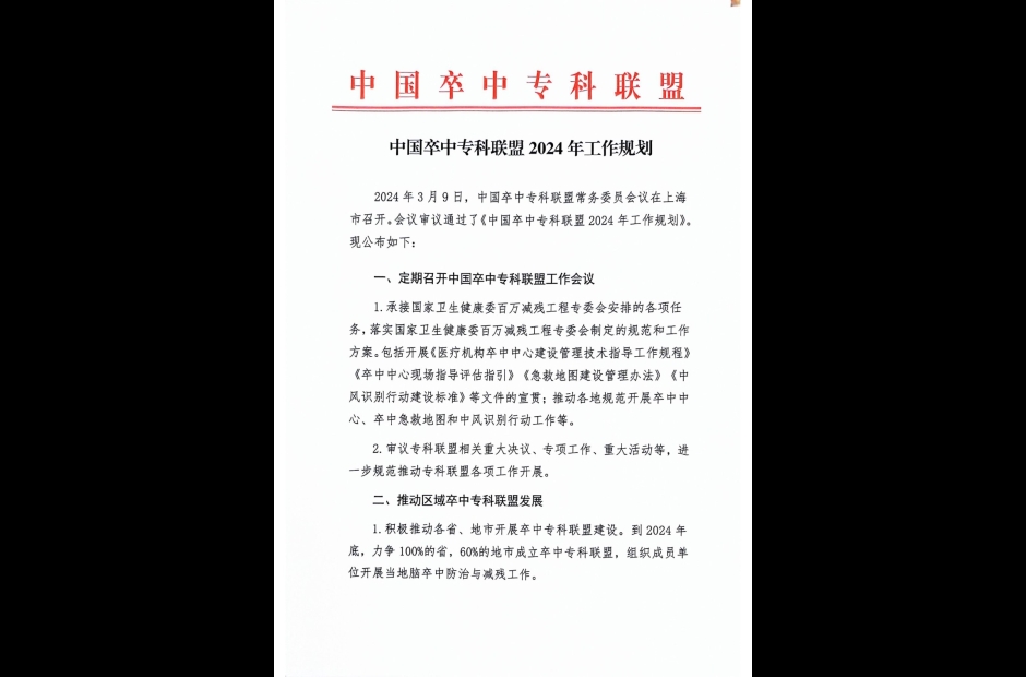 中国卒中专科联盟2024年工作规划